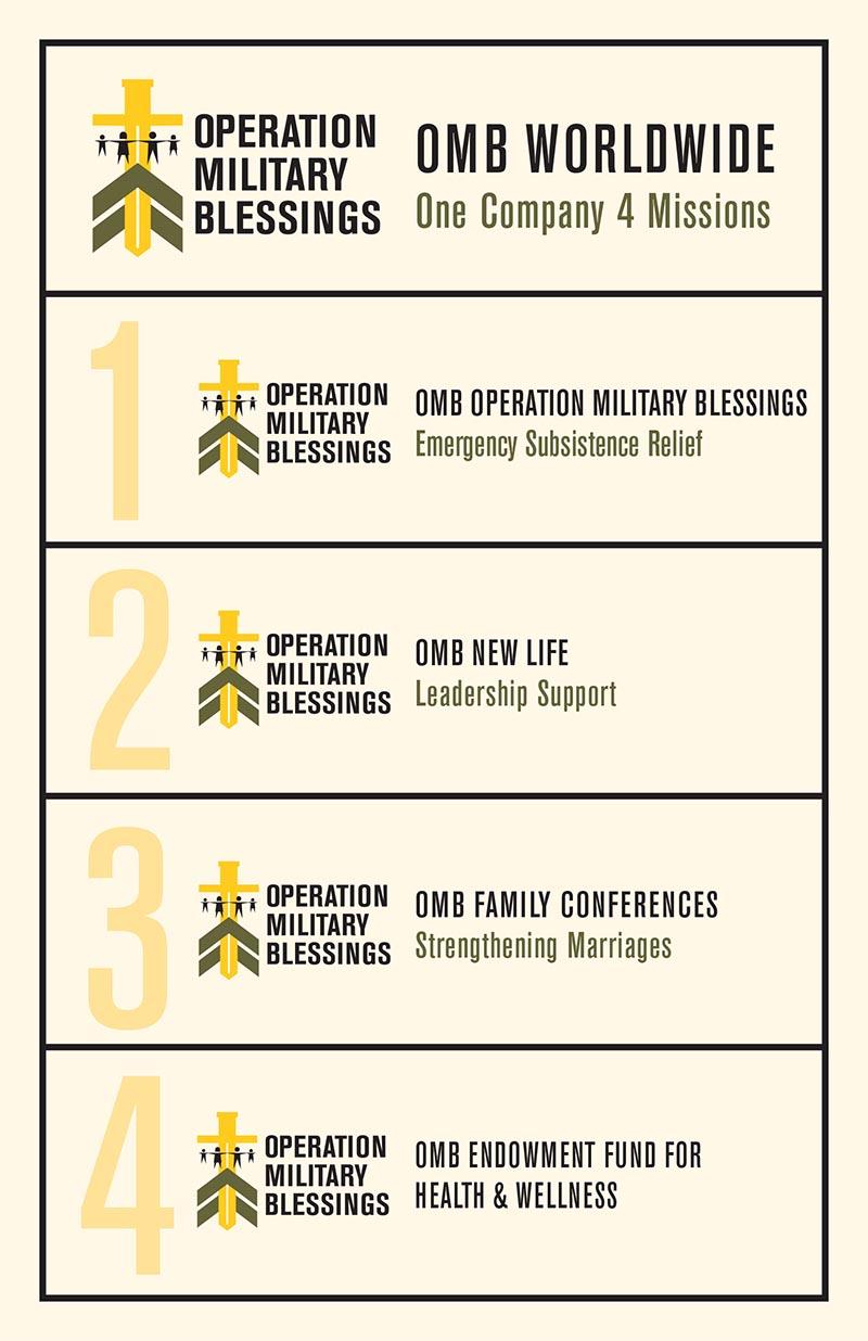 The military outreach grew over the years, meeting the needs of young military families. Each year at Christmastime OMB provides Christmas food boxes and toys for children of junior grade enlisted military families who would not otherwise have a meaningful Christmas. This quickly led to the distribution of large scale emergency subsistence aid and catastrophic grant relief to young enlisted families in crisis.